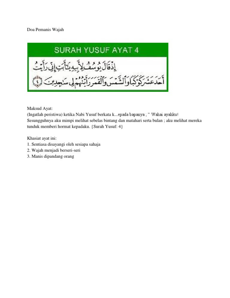 Kehidupan nabi yusuf sering diuji. Jika ada yang putus mesti di lagi dari pertama lagi. Jun 14, 2017 · jadi, amalkan doa agar muka nampak cantik dan ayat pengasih surah yusuf ayat 4 serta surah thaha ayat 39 seperti yang dikongsikan di bawah ini untuk mereka yang ingin terlihat cantik di depan suami, disukai semua orang, wajah bercahaya, cantik luar dalam, pemanis wajah untuk wanita dan lelaki dan banyak lagi. Jika anda membuat carian di internet tentang doa nabi yusuf, anda akan jumpai banyak perkongsian tentang doa nabi yusuf untuk mencantikkan wajah dan dijadikan sebagai doa pengasih. More images for doa pemanis wajah dalam al quran » Meski tidak menggunakan make up yang tebal, seorang wanita bisa nampak cantik bersinar bila rajin mengamalkan doa ini. Nampak selalu bersinar seperti bidadari. Doa pemanis wajah dalam al quran. Doa pemanis wajah paling ampuh. Dibawah ini adalah doa pemanis wajah untuk pria ataupun wanita yang diambil dari ayat dalam al quran. Namun, sebenarnya banyak lagi doa yang nabi yusuf panjatkan kepada allah swt seperti yang tertulis di dalam surah yusuf as. Cara mengamalkan doa pemanis wajah untuk pria Dengan mengamalkan doa nabi yusuf untuk kencantikan dan pemanis wajah alami ini, niscaya kulit wajah dan tubuh anda akan lebih mempesona dan terlihat bersinar.