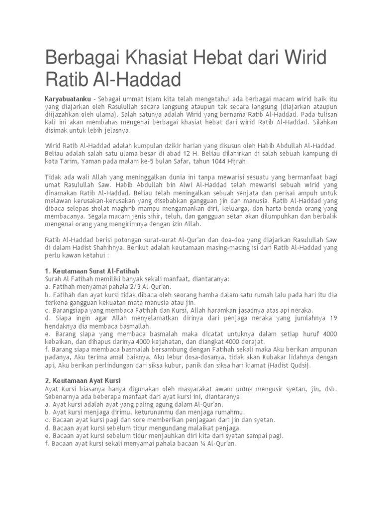 Bacaan ratib al haddad, sejarah, khasiat dan doa (lengkap). Ratibb al haddad adalah sebuah amalan atau dzikir yang sering dilakukan oleh . Dari sejumlah literatur dijelaskan, khasiat membaca ratibul haddad sangat banyak sekali. Habib muhsin al athos adalah . Artikel panjang berikut ini adalah .